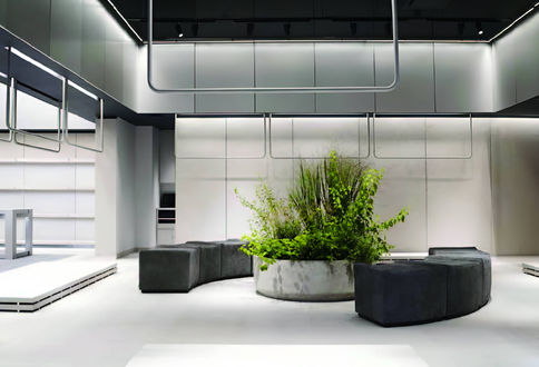 This luxury fashion flagship is located in the iconic GM Building. The architecture includes materials and furnishings commonly found in exterior public spaces: concrete sidewalk pavers, automotive fabric as upholstery, concrete planters with overgrown vegetation. At the center of the project, a ribbon of LED screens displaying curated motion imagery brings the space to life with kinetic energy and washes the urban-like interior in color.