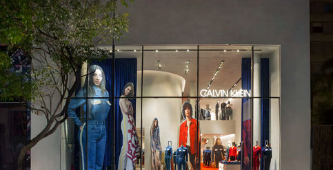 Oversized campaign imagery 'cutouts' serve both as a visual merchandising tool, an immersive display window, and a spatial point of interest to invite the attention of the passerby.